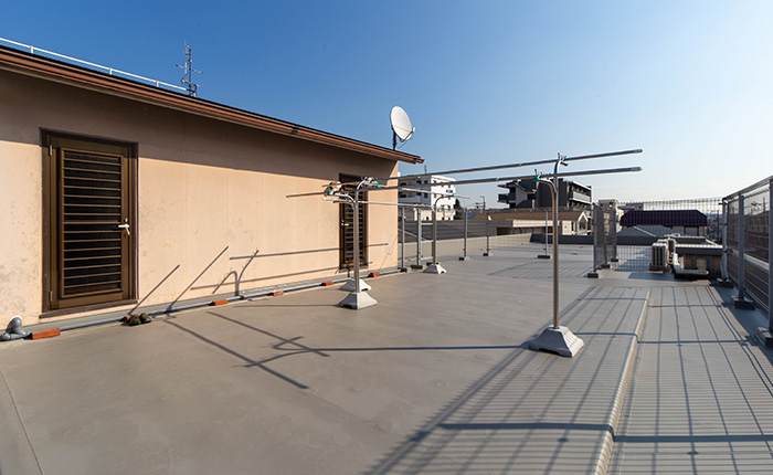 屋上階にはソーシャルアパートメント(シェアハウス)居住者専用に、広々とした開放感溢れるテラスを設けています。屋上テラスは日当たりがいいので、物干しを設置し洗濯物干しスペースとしてご利用頂けるようになっております。屋上テラスの入口には屋内には居住者の方がご利用頂ける洗濯機と乾燥機を各2台設置しております。